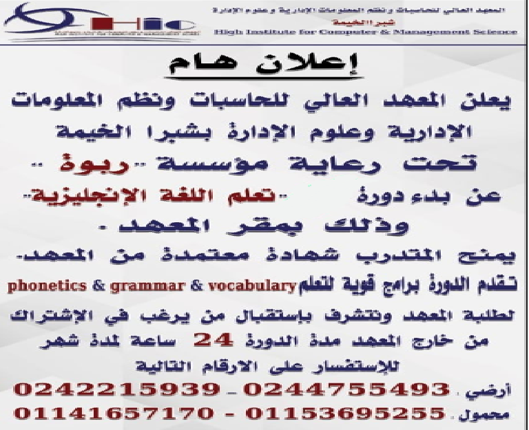 إعلان هام لطلاب الفرقة الرابعه حرصا من إدارة المعهد على مصلحة أبناءنا الطلاب قررت إدارة المعهد كتابة وطباعة مشاريع التخرج لجميع الطلاب مجانا وعلى كل طالب ابتداء من الأسبوع القادم التوجه في موعد المشروعات المحدد بالجدول الدراسي للأستاذ الدكتور المشرف على المشروع